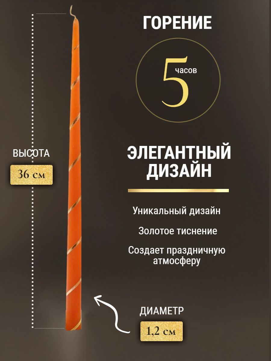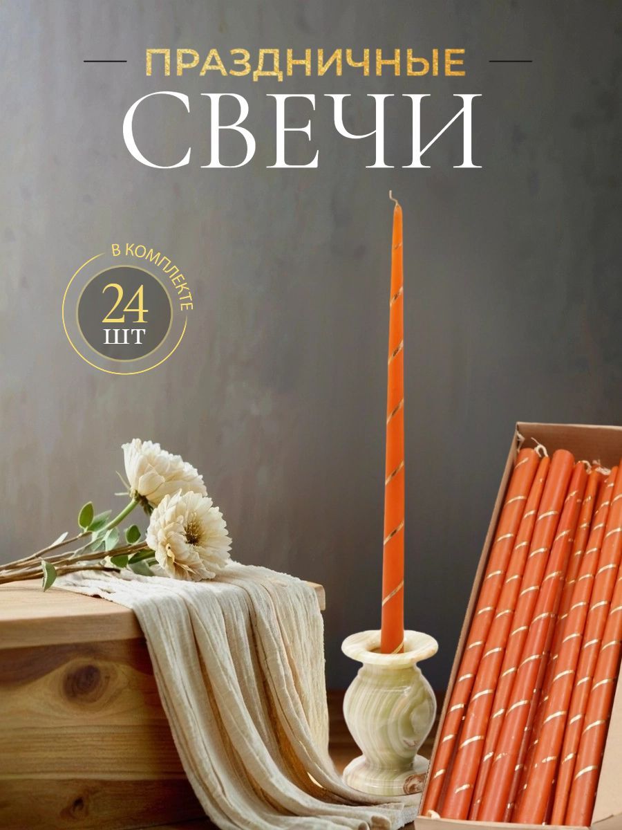Свечи золоченые конусные №55, СПИРАЛЬ (Золото), ОРАНЖЕВЫЕ (24шт)